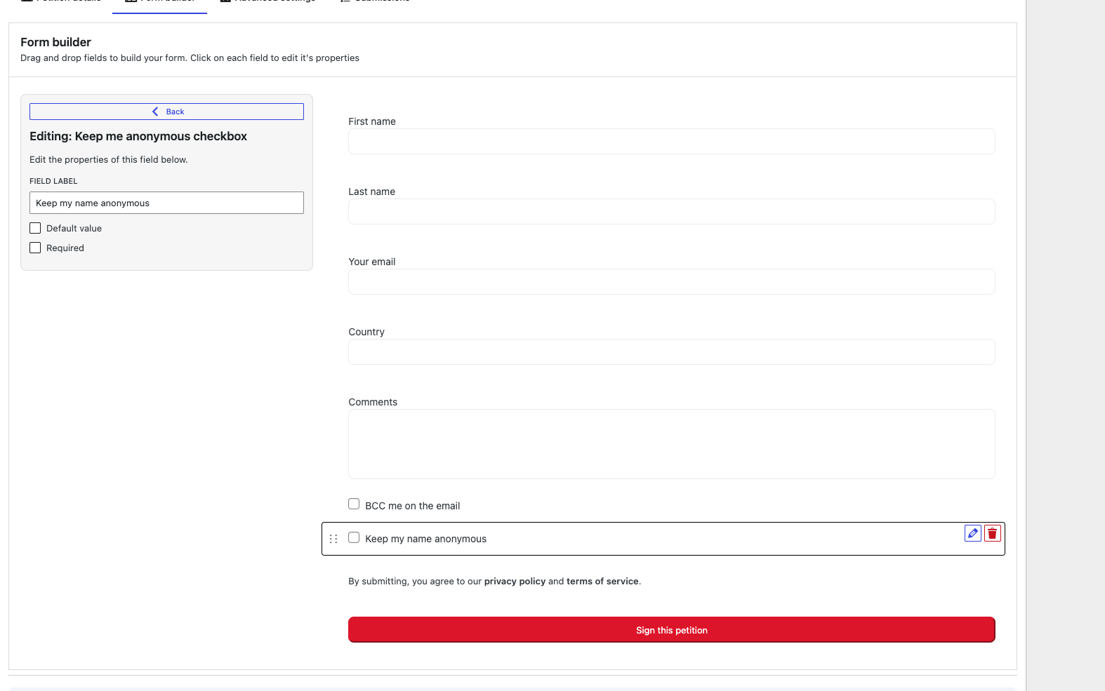 This field allows signers to choose whether their name appears in the public list of petition signatures. When enabled, users can opt to sign the petition anonymously while still contributing to the petition count. Note: Administrators can always view the signer’s information in the backend, and the name will be included when sending emails to representatives.