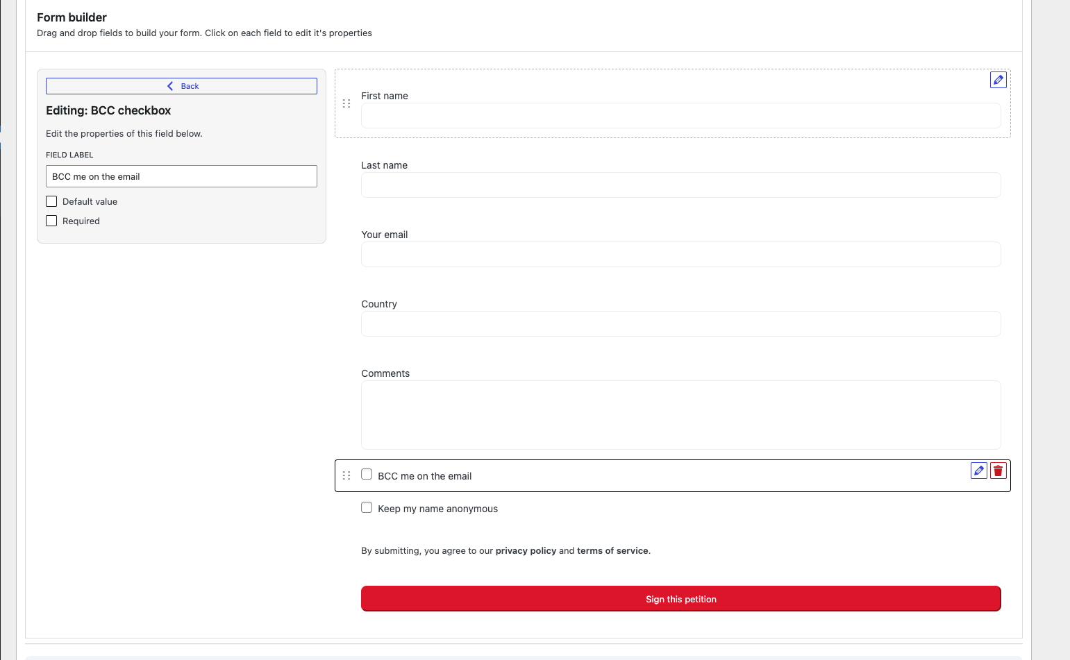 This field allows signers to receive a copy of the email sent to the representative. When checked, the signer will be added to the BCC (Blind Carbon Copy) field of the outgoing email. Note: This option only functions when email-to-representative functionality is enabled in your petition settings.